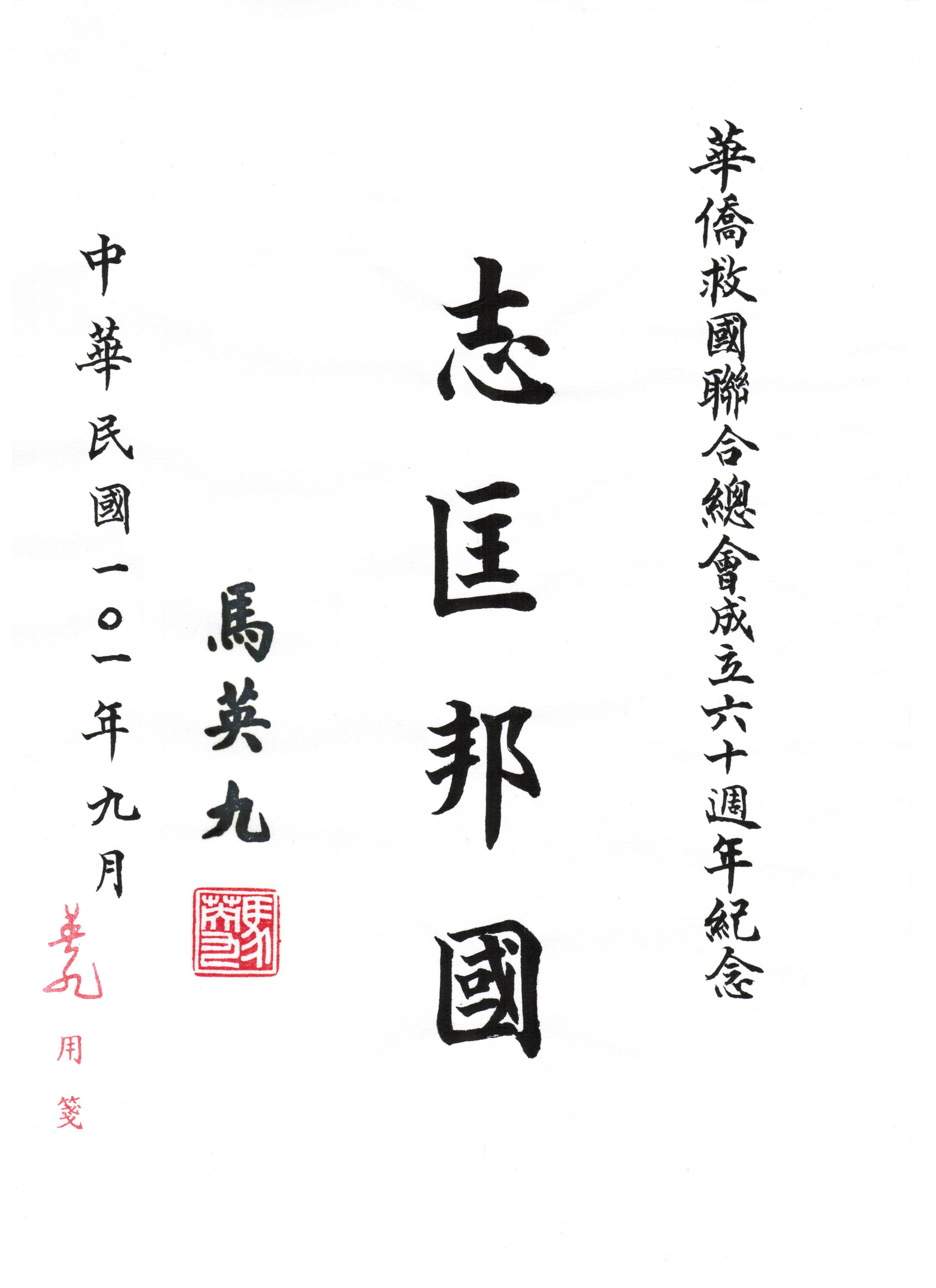 僑光社/台北 華僑救國聯合總會成立60周年,馬總統特頒「志匡邦國」賀詞嘉勉。