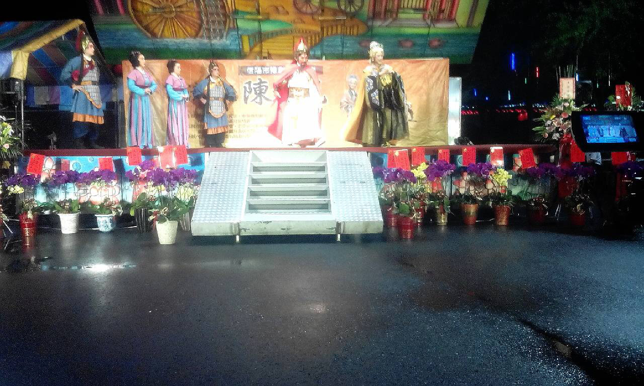 103年信陽市豫劇團「開漳聖王陳元光」豫劇台灣巡迴公演,除5月29日花蓮新城鎮安宮之外,5月31日台南新營同濟宮,6月 2日南投名間大賢宮,6月3日新北市新店太平宮,6月4日桃園大園福隆宮,6月5日基隆文化中心文化廣場,6月6日台北市228公園,6月7日宜蘭冬山聖福廟。