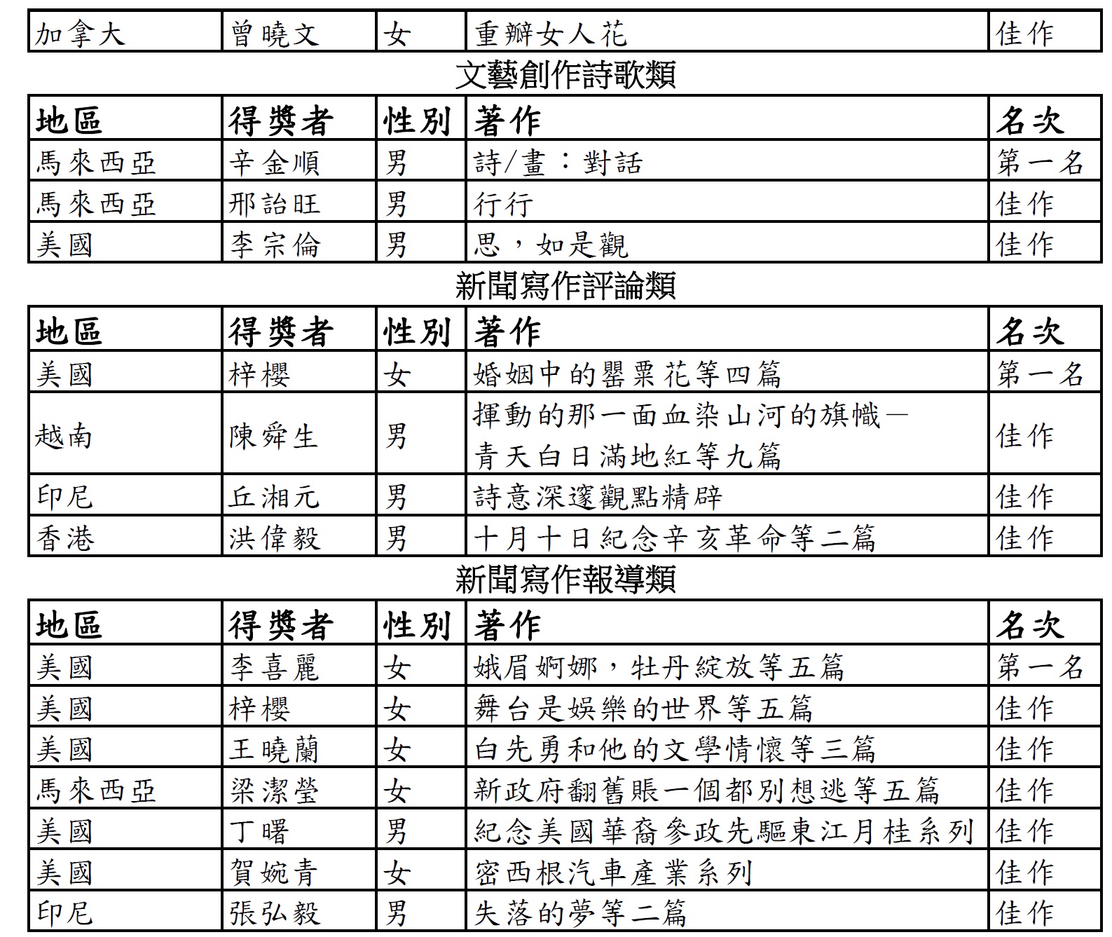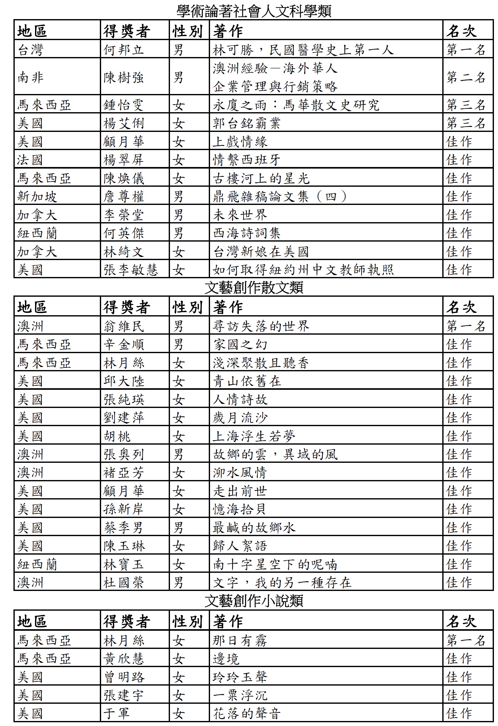 僑光社/台北 華僑救國聯合總會107年海外華文著述獎揭曉,何邦立、翁維民、林月絲、辛金順、梓櫻、李麗喜等6人,分獲學術論著社會人文科學類、文藝創作散文類、文藝創作小說類、文藝創作詩歌類及新聞寫作評論類、新聞作報導類首獎。前三名得主將獲得獎金、獎狀等獎勵。 根據華文著述獎辦法規定,學術論著獎第一名獎金新台幣參萬元、第二名新 台幣貳萬元、第三名新台幣壹萬元,另取佳作若干名,發給獎狀。文藝創作獎三名及新聞寫作獎二名,每名獎金新台幣壹萬元,另取佳作若干名,發給獎狀。 (各類組得獎名單見附表)