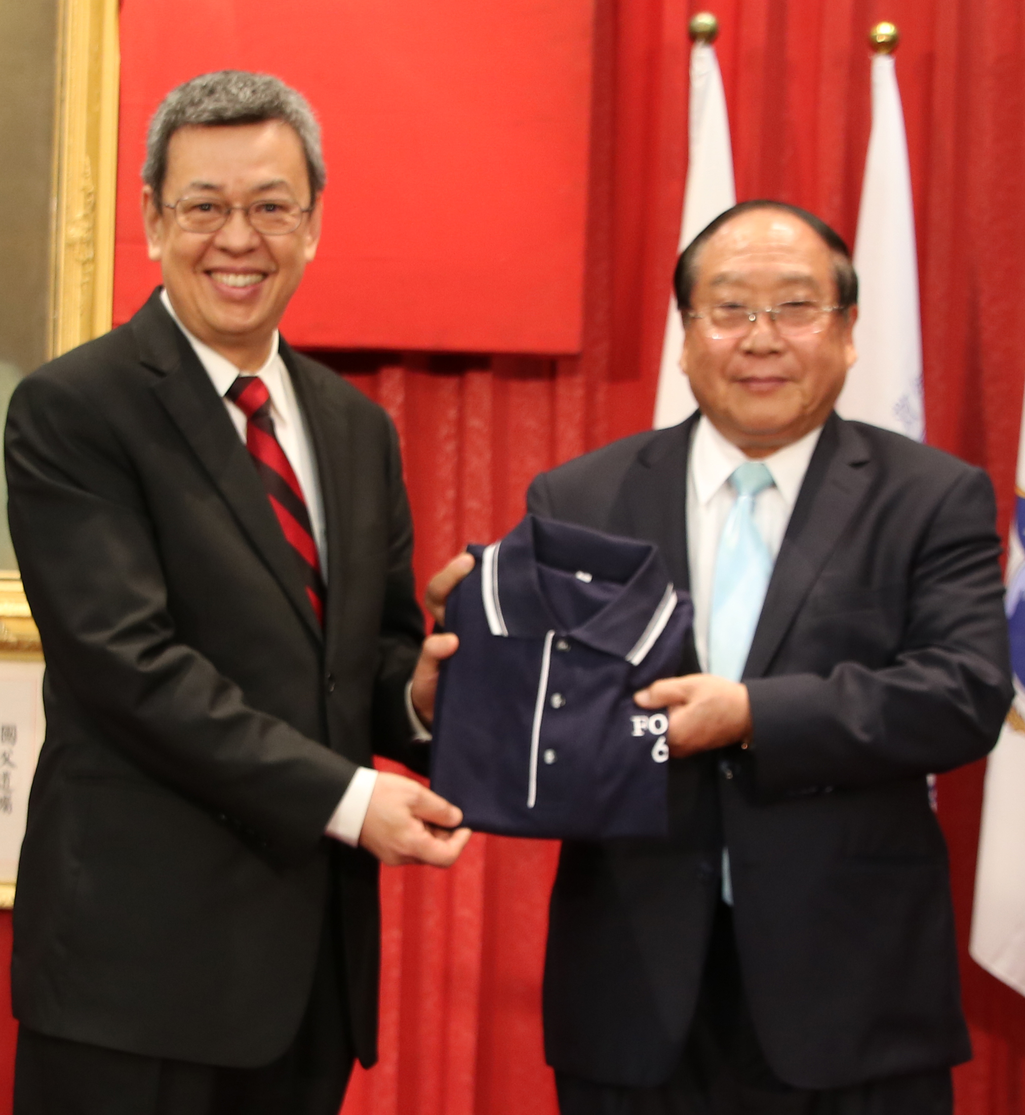 鄭理事長及僑聯總會泰國辦事處陳鴻彰主任,分別以「僑聯66年紀念POLO衫」等紀念品贈送四位貴賓。